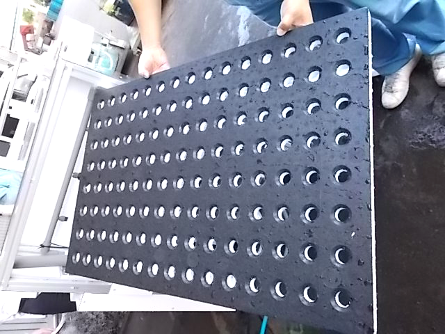 何とか製造もこなせるようになりましたが、透明のビニ-ル袋に梱包し夏場の太陽光を浴びせたところ、黒色の面が太陽光を吸収し袋内がかなり高温となり三次発泡(ふくれあがり)が発生。 三次発泡の危険性が確認できたので、出荷時の梱包袋を半透明・白色に変更しました。